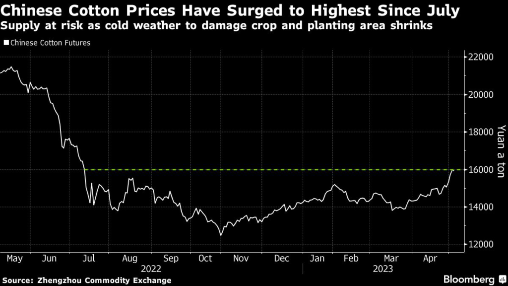 (Bloomberg) — Cotton production in top grower China could decline this year after frigid weather delayed sowing and hurt plants in some areas, and acreage dropped as some farmers followed government advice and switched to grain.