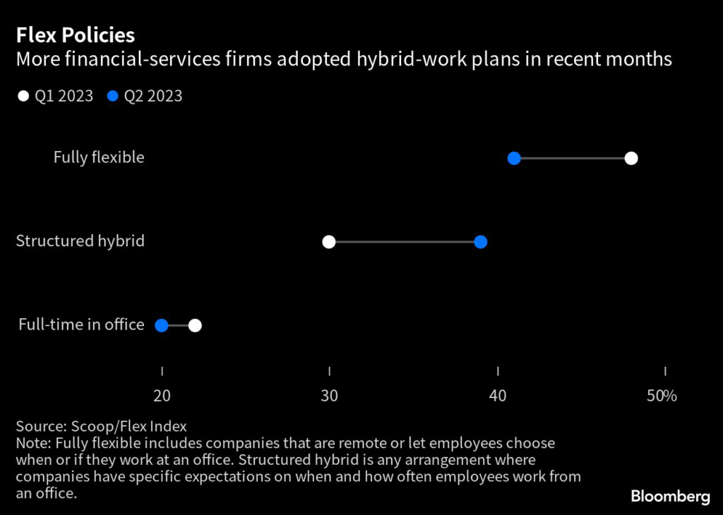 Just 20% of financial-services companies require full-time in-office work, according to a new survey of 251 industry firms by Scoop, which helps companies coordinate hybrid teams.