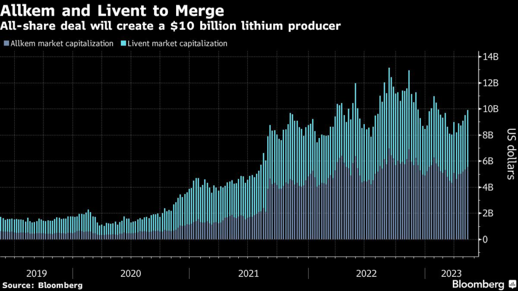 Australian lithium miner Allkem Ltd. agreed to merge with US rival Livent Corp. in an all-stock deal that will create a $10.6 billion producer, as the sector continues consolidating amid surging demand for batteries used in electric vehicles.
