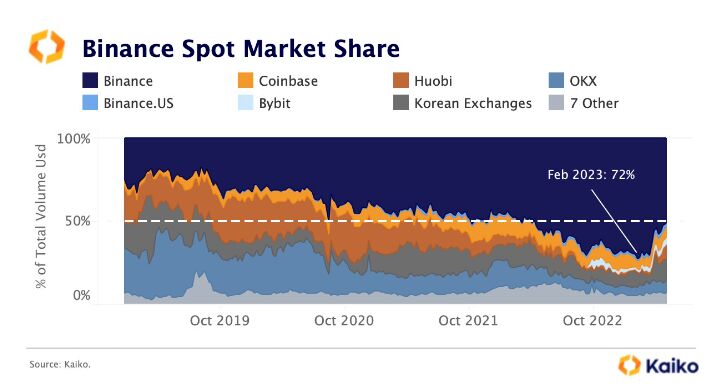 The world’s largest digital trading platform now commands about 50% of spot market share, the lowest since April 2022, according to Dessislava Ianeva, senior research analyst at Kaiko.