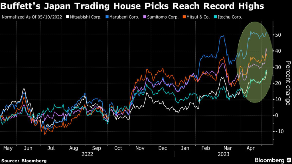 (Bloomberg) — Shares of the Japanese trading companies that Warren Buffett has invested in reached record levels this week after announcing earnings and buybacks.