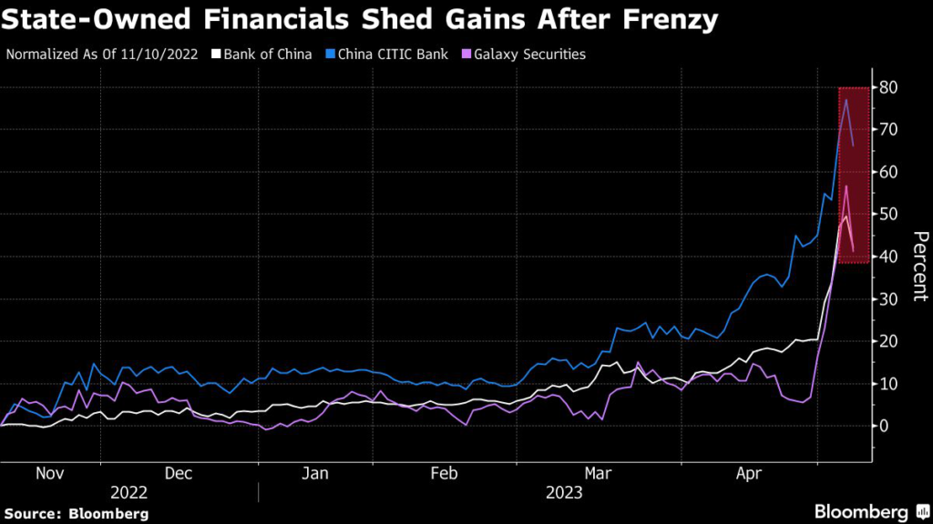 (Bloomberg) — A scorching stock rally in China’s state-linked companies lost further momentum Wednesday, as investors cashed in on the robust gains recorded by financial behemoths and infrastructure builders.