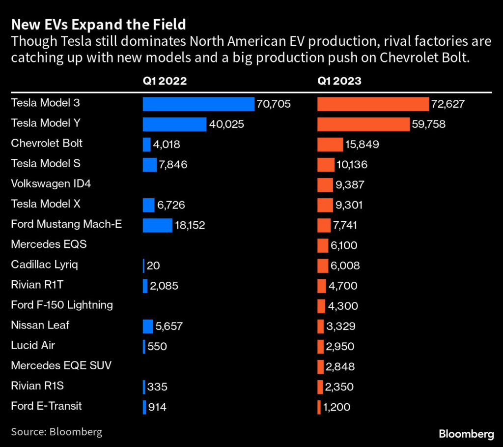 The carmaker boosted North American production of each of its four vehicles in the first quarter, according to Bloomberg Intelligence, and bolted together more than 150,000 cars in total. But it’s a parade of entirely new cars and trucks that is starting to really move the needle on EVs in America.