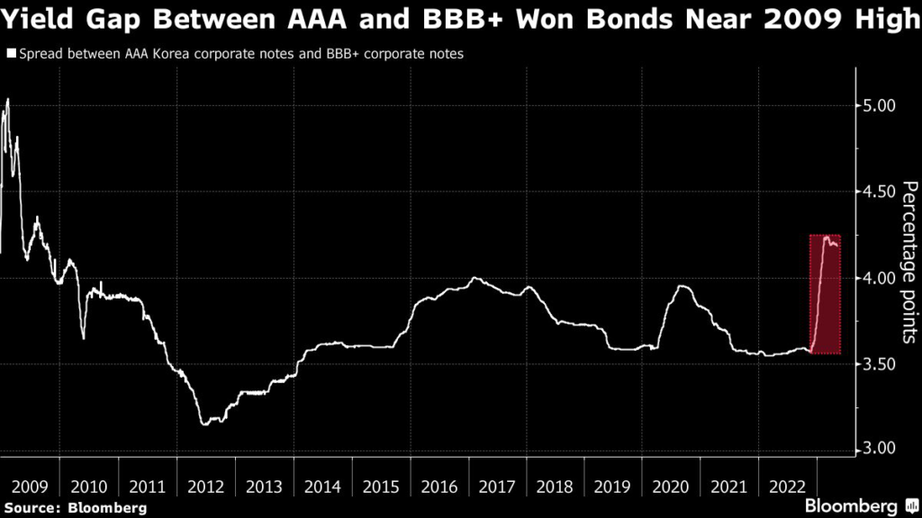 Yields on BBB+ rated Korean notes in March exceeded AAA debt yields by the most since 2009, and the gap remains near that level, Bloomberg-compiled data show.