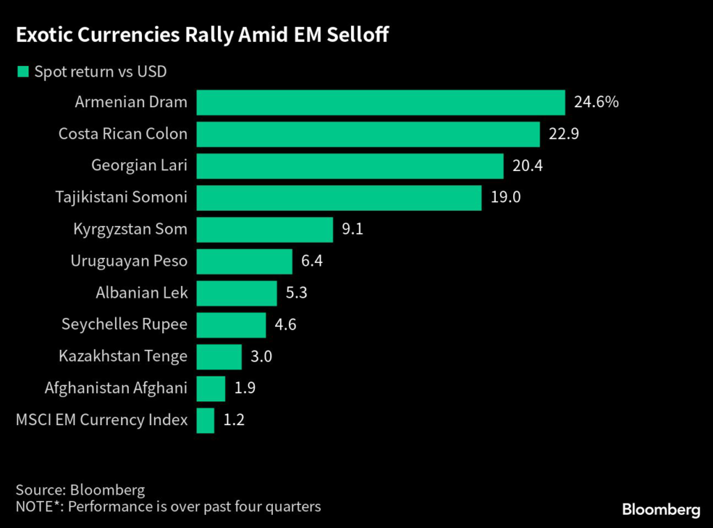 He pointed at the currency performances of his top bets in the exotic space: the Armenian dram up 25%, the best performance among about 70 exotic currencies tracked by Bloomberg over the past four quarters; and the Georgian lari, up more than 20%.