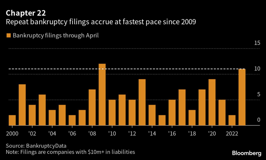 The 11 repeat bankruptcies filed through April already tops the tally for all of 2021 or 2022 and the spate of Chapter 22 filings through the first four months of the year has been eclipsed only once since 2000, according to BankruptcyData.