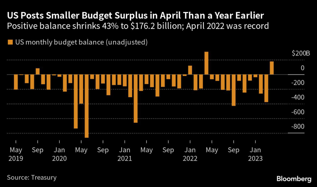 (Bloomberg) — The US federal government’s budget surplus for April was down 43% from a year ago, thanks to a slide in tax revenues for the month that annual household filings are due.