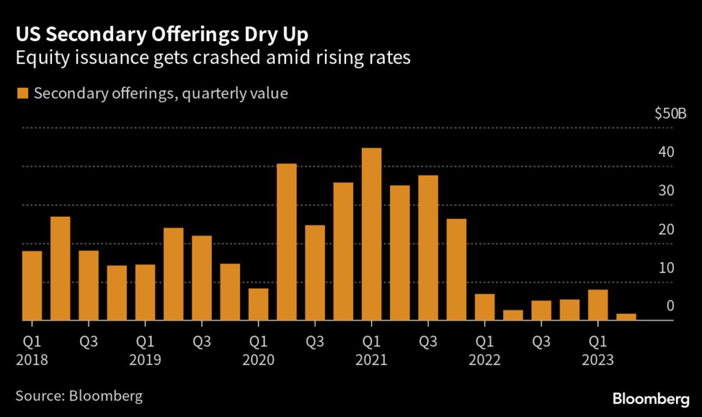 While the volume of US secondary offerings this year has reached $9.7 billion, up from $8.9 billion in the same period a year ago, it’s still way below a pre-pandemic level of almost $29 billion.