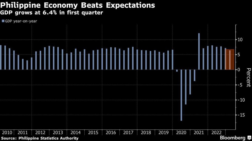 The Philippine economy expanded faster than expected in the first quarter, as resilient post-pandemic demand helped defy elevated inflation and the central bank’s aggressive monetary tightening.
