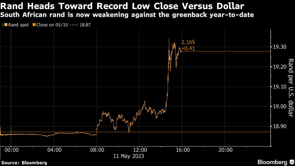 (Bloomberg) — South Africa’s rand tumbled, heading for a record low against the dollar, as geopolitical risks added to investor concerns over a domestic energy crisis and global monetary tightening.