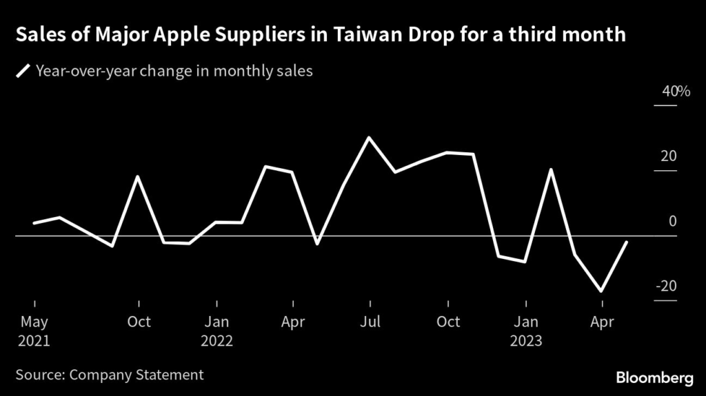 (Bloomberg) — The total revenue of Taiwan’s major Apple suppliers has fallen for a third straight month in April, as recession-wary consumers scale back spending on smartphones and computers.