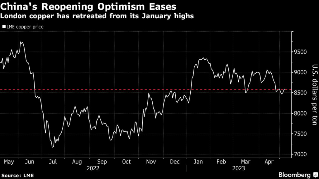 A survey of purchasing managers showed the factory sector contracting in April for the first time this year, while copper imports dropped to their lowest since October. Chinese imports of the metal in the first four months are lagging 13% behind the pace set in 2022, a year that saw copper purchases boom despite generally weaker demand for other commodities.