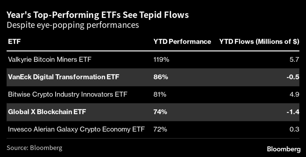 The five best-performing funds in 2023 — the Valkyrie Bitcoin Miners ETF, the VanEck Digital Transformation ETF (DAPP), the Bitwise Crypto Industry Innovators ETF (BITQ), the Global X Blockchain ETF (BKCH) and the Invesco Alerian Galaxy Crypto Economy ETF (SATO) — have been atop the performance leaderboard all year as crypto prices overall have made a big rebound.