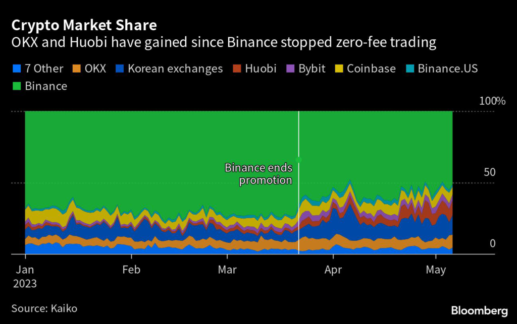 (Bloomberg) — Crypto exchanges Huobi and OKX benefited after rival Binance curbed a zero-fee promotion and shed market share in the spot trading of digital assets, according to data from research company Kaiko.