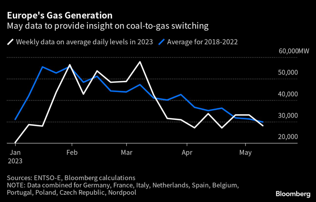 Combined gas-fired power generation in key European Union members has moved closer to seasonal norms in recent days — after being far below that level in April — while coal burn dropped, according to data from grid group ENTSO-E, compiled by Bloomberg.