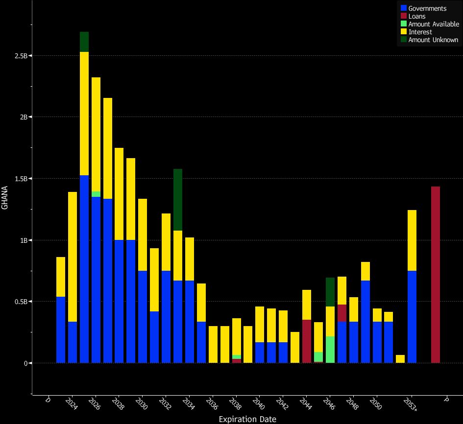 Ghana owes bilateral debt of $1.9 billion, a fraction of its total public liabilities of 575.7 billion cedis ($53 billion) at the end of November.