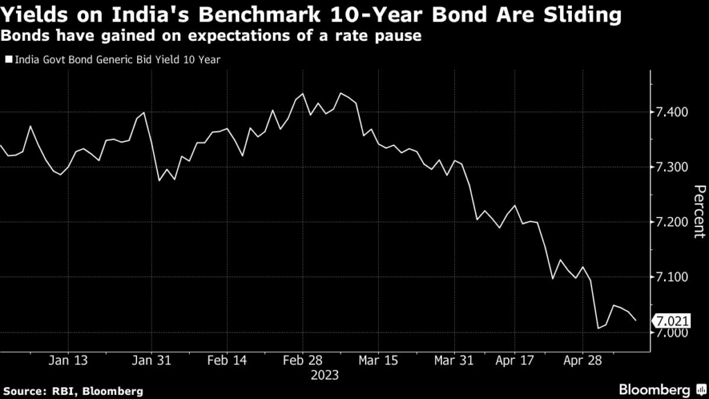 (Bloomberg) — Consumer prices in India continued to slide in April, giving the central bank room to keep rates on hold after an aggressive tightening campaign dampened demand and muddled the wider outlook for the economy.