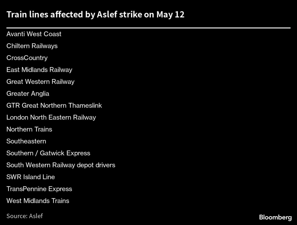 On Saturday, a separate labor group — the RMT — will hold a strike for thousands of rail workers, in a move that could disrupt the final of the Eurovision Song Contest in Liverpool.