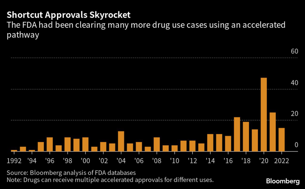 Last year, seven drugs lost accelerated approvals, tied with 2021 for the most ever, according to a Bloomberg News analysis. The withdrawals were done voluntarily by the companies, often at the agency’s request but not always.