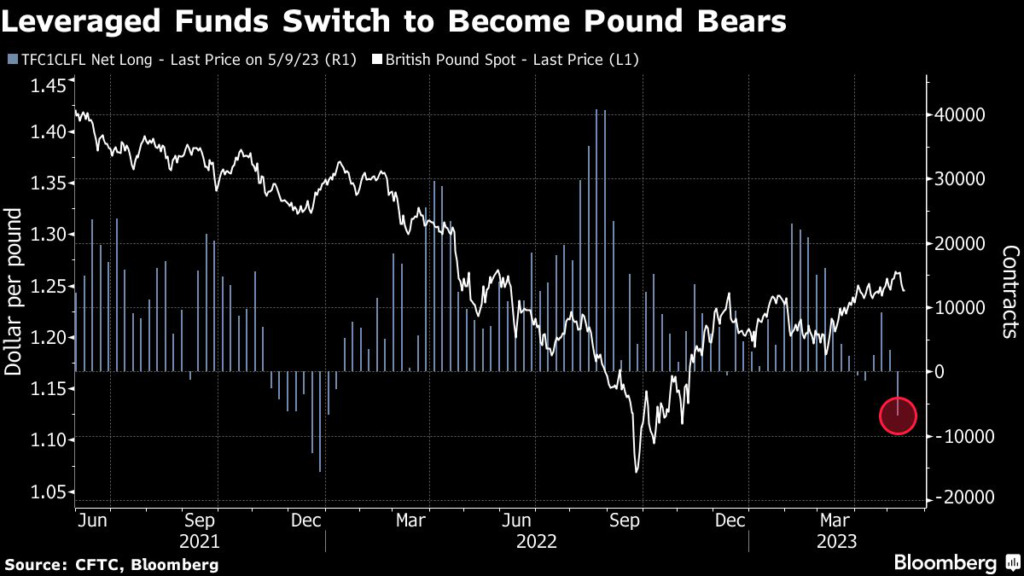 Leveraged investors scrapped a position that profits from a stronger sterling and turned the most negative on the currency since December 2021, according to data from the Commodity Futures Trading Commission for the week ended May 9.