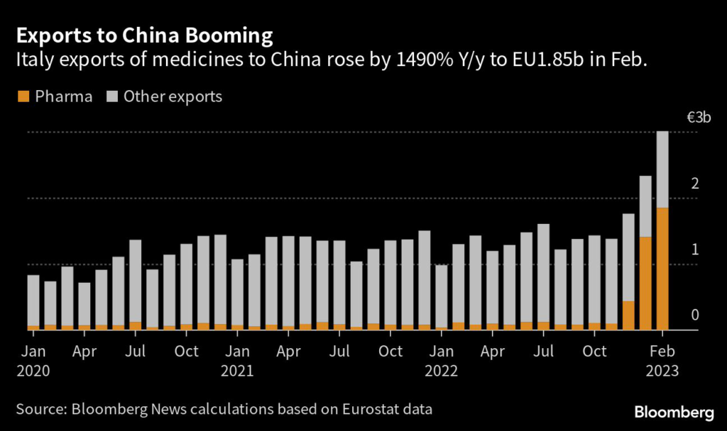 So the sudden end of China’s Zero Covid strategy and the subsequent wildfire spread of the virus across the country might be behind the export boom, although the vast majority of China’s population looks to have gotten Covid in December and January, meaning they would have recovered before Italian exports started rising.