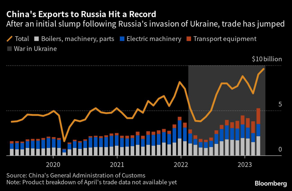 China’s exports to Russia hit a record in April, jumping 153% from a year earlier to $9.6 billion, while the world’s second largest economy imported $9.6 billion worth of oil, gas and other goods, taking total trade to the second-highest level on record.
