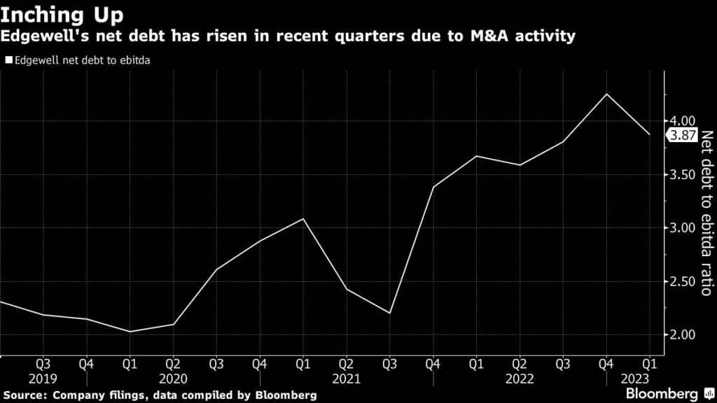 The company expects that to decline to 3.5 times as of the end of September, the end of its fiscal year. Household-products companies such as Edgewell usually aim for a ratio of net debt to ebitda of around two times, according to Bloomberg Intelligence analyst Deborah Aitken.