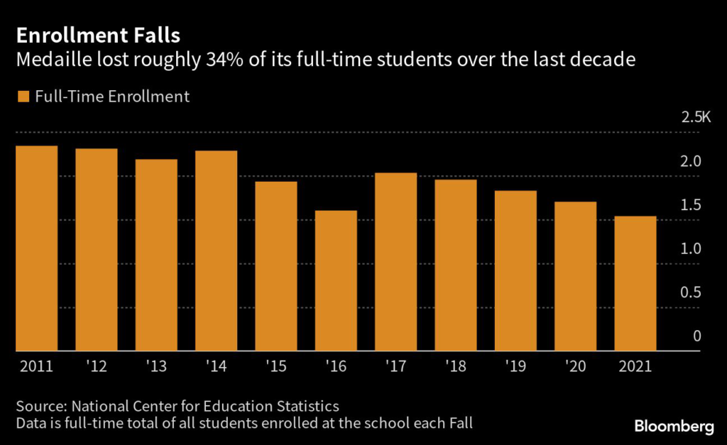 Medaille’s enrollment fell to about 1,537 full-time students in 2021 from about 2,340 a decade earlier, according to data from the National Center for Education Statistics.