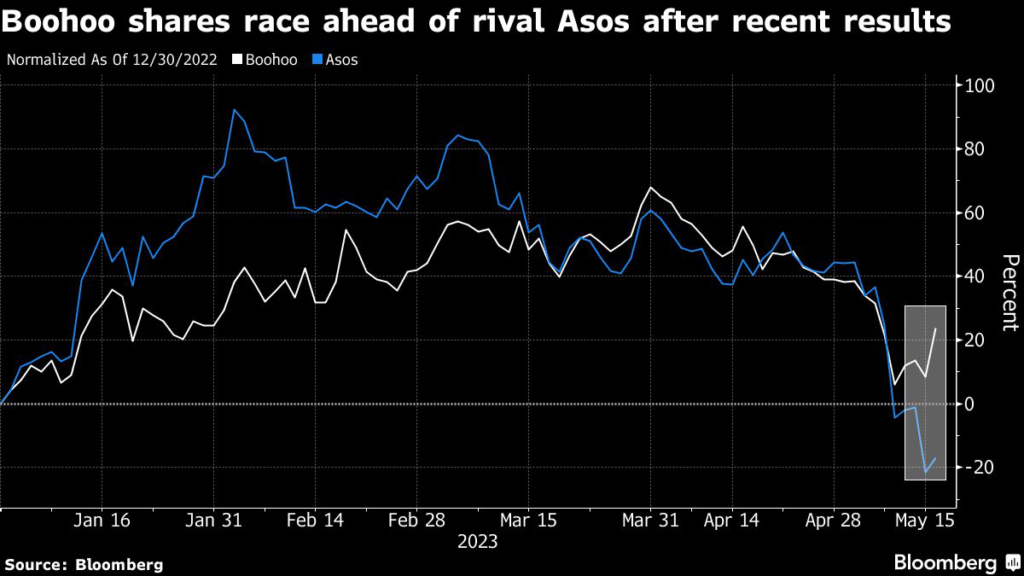 (Bloomberg) — Boohoo Group Plc shares are racing ahead of online fast-fashion rival Asos Plc after the Manchester-based company surprised investors by generating cash even as UK consumers cut back spending in the cost-of-living crisis.