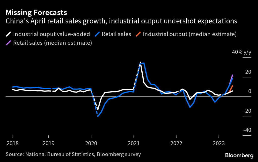 Official data Tuesday showed industrial output, retail sales and fixed investment grew at a much slower pace than expected in April.