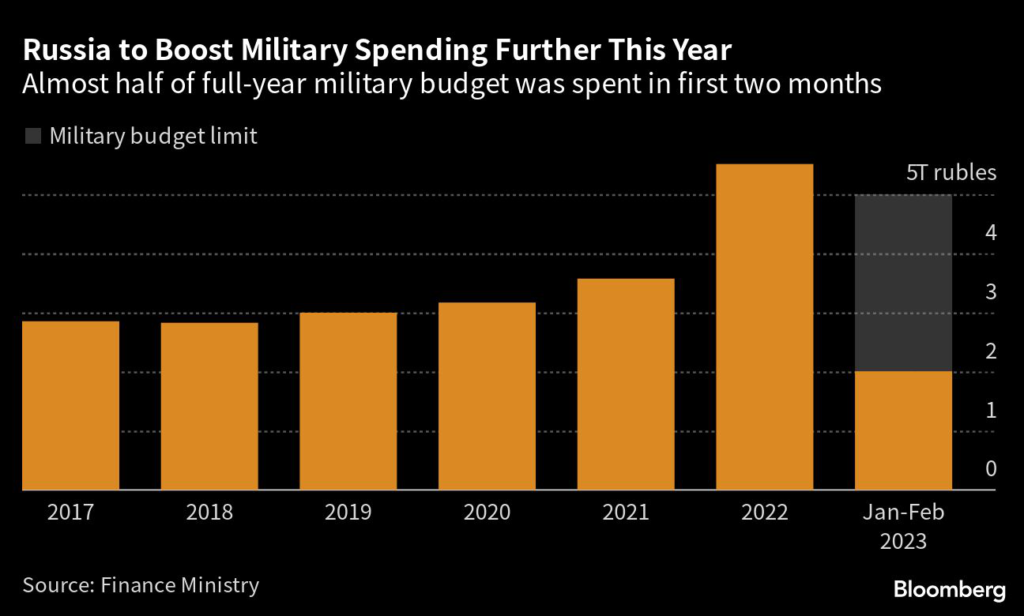 That helps explain why Russia spent almost half of its 2023 military budget in the first two months of the year, reaching $25 billion, according to the Finance Ministry.