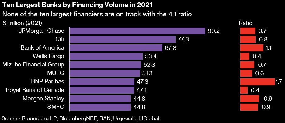 As recently as the end of 2021, Morgan Stanley’s financing split resulted in a ratio of 0.9, broadly in line with the average for the broader finance industry, BloombergNEF said.