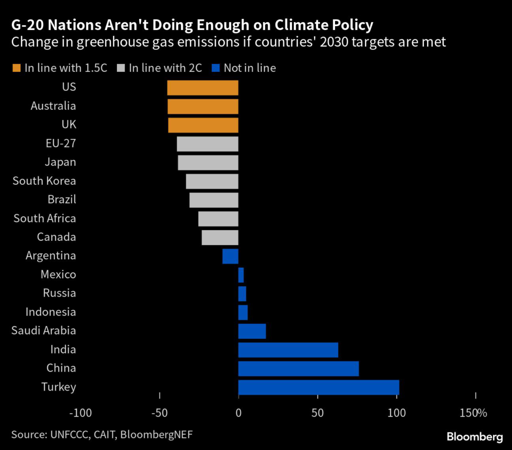 The BNEF report gives each G-20 country a score for their climate policies, weighted by each sector’s share of greenhouse gas emissions.