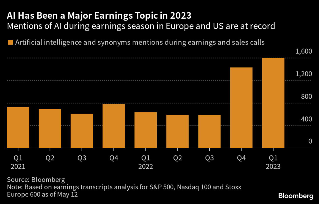 There have been about 1,600 mentions of AI by US and European firms in first-quarter earnings conference calls, a record number, according to transcripts analyzed by Bloomberg.