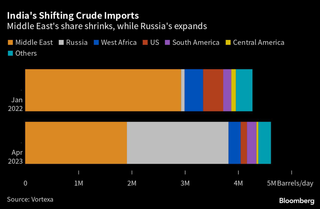 Since January 2022 — the month before Russia invaded Ukraine — India’s oil imports from the Middle East have plunged by 35% to about 1.9 million barrels a day in April, data from Vortexa Ltd.