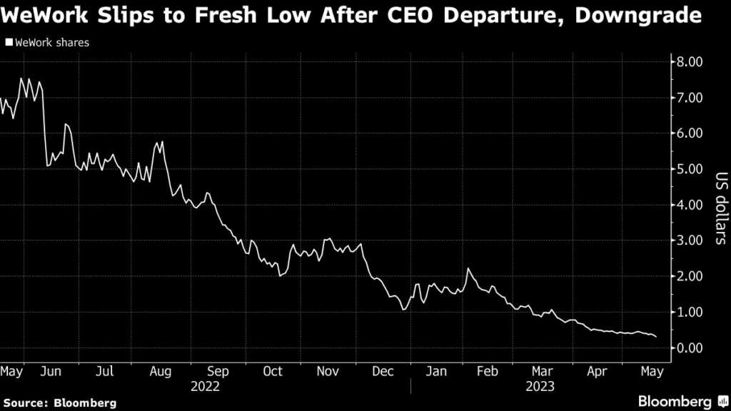 (Bloomberg) — WeWork shares slumped 25% to an all-time low Wednesday after an abrupt CEO change prompted analysts at Mizuho to downgrade the co-working real estate company to neutral from buy.