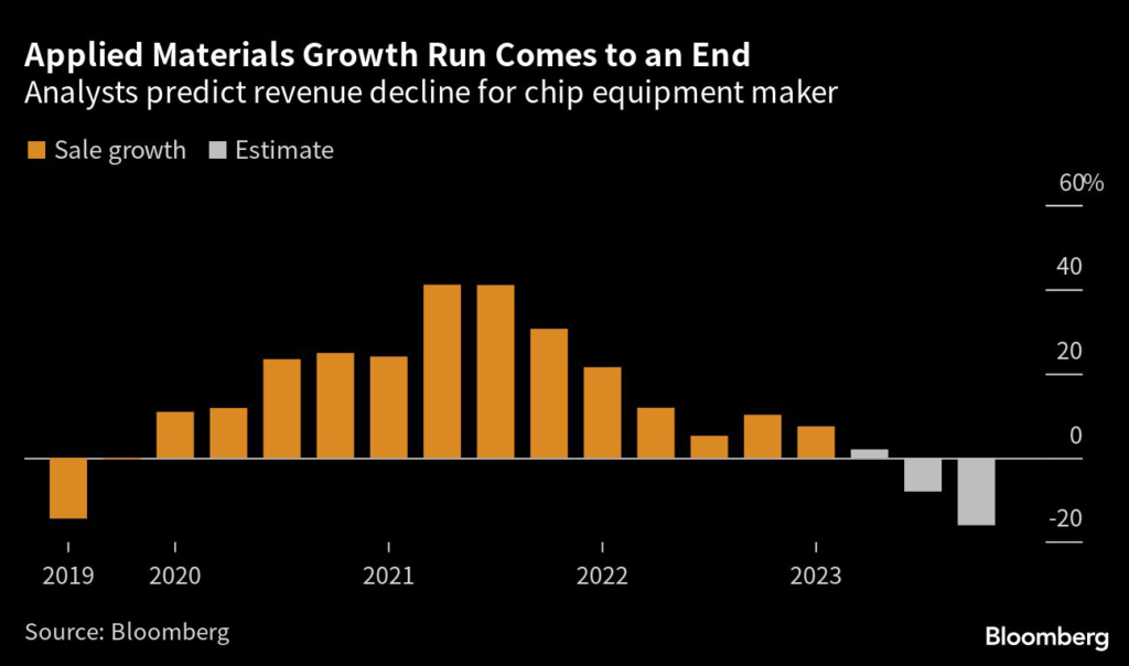 Makers of memory chips are struggling with a historic glut of inventory, forcing them to cut spending on equipment upgrades and new factories. That’s hurt orders for companies like Applied Materials, threatening a pandemic-era growth run.