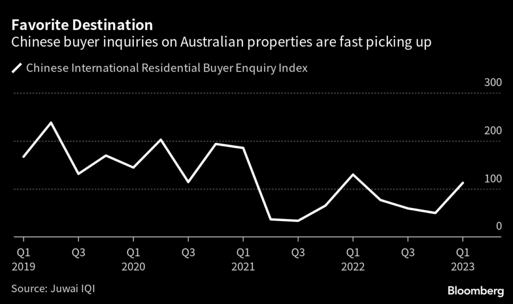Buyer inquiries from China for Australian properties soared 127% in the first three months of the year from the final quarter of 2022, according to data from real estate firm Juwai IQI.