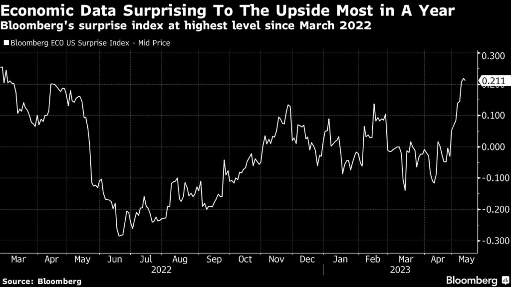 Bloomberg’s US surprise index, which reflects whether economic data tops or misses consensus Wall Street estimates, rose this month to the highest level since March 2022.