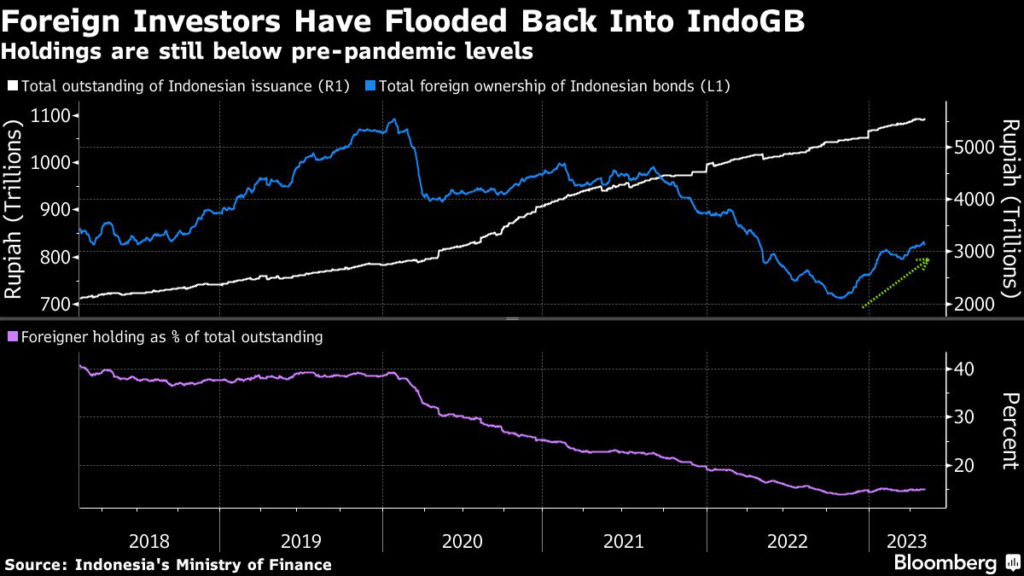 BI’s move and bets the global rate hike cycle is also ending have seen foreign investors plow $4.1 billion into Indonesian debt this year, the second biggest inflow in Asia, according to data compiled by Bloomberg.