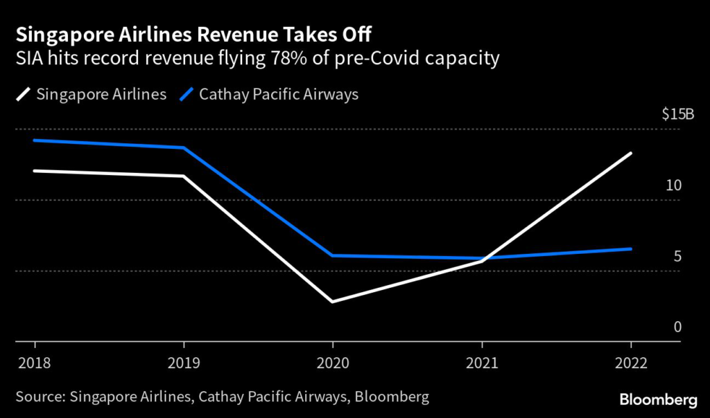 Hong Kong rival Cathay Pacific Airways Ltd. has a way to go before it gets to those heights, with last year’s revenue still only about half of pre-pandemic levels.