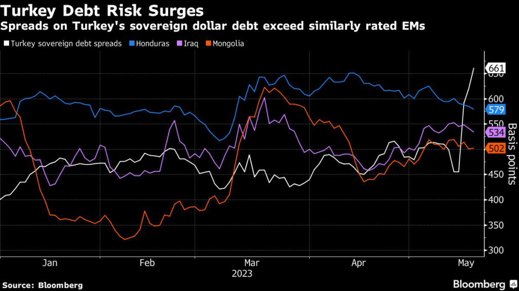 (Bloomberg) — Investors are demanding the highest risk premium for Turkey’s sovereign dollar bonds in almost 10 months, as the prospect of a runoff election damps some hopes for an end to unorthodox economic policies.