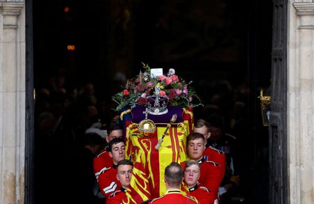 LONDON (Reuters) -British government departments spent an estimated total of 161.7 million pounds ($204 million) on Queen Elizabeth’s state funeral and related events, the Treasury said on Thursday.