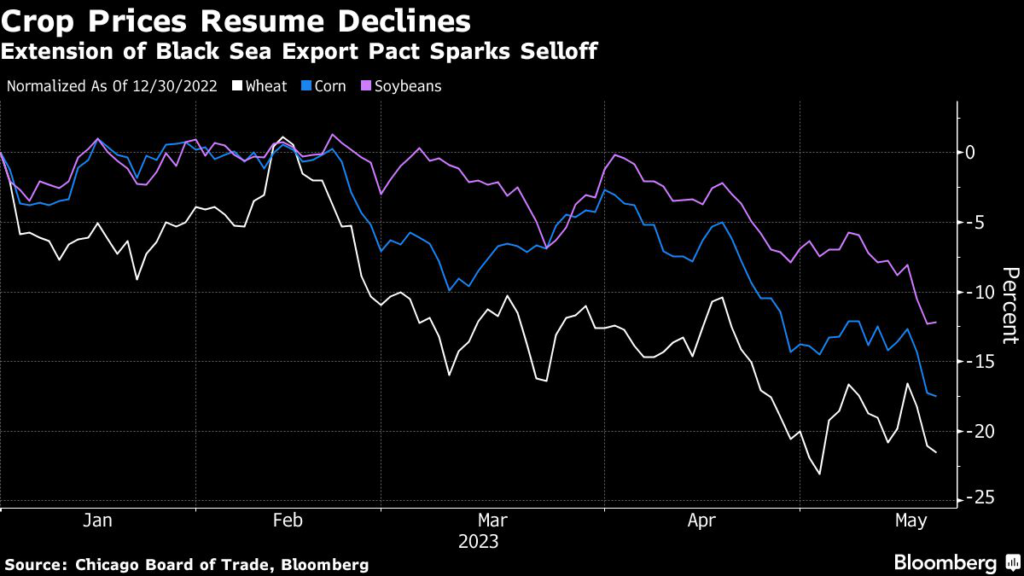 Corn traded near the lowest level since November 2021 after a two-month extension of a deal allowing Ukraine to ship crops through the Black Sea.