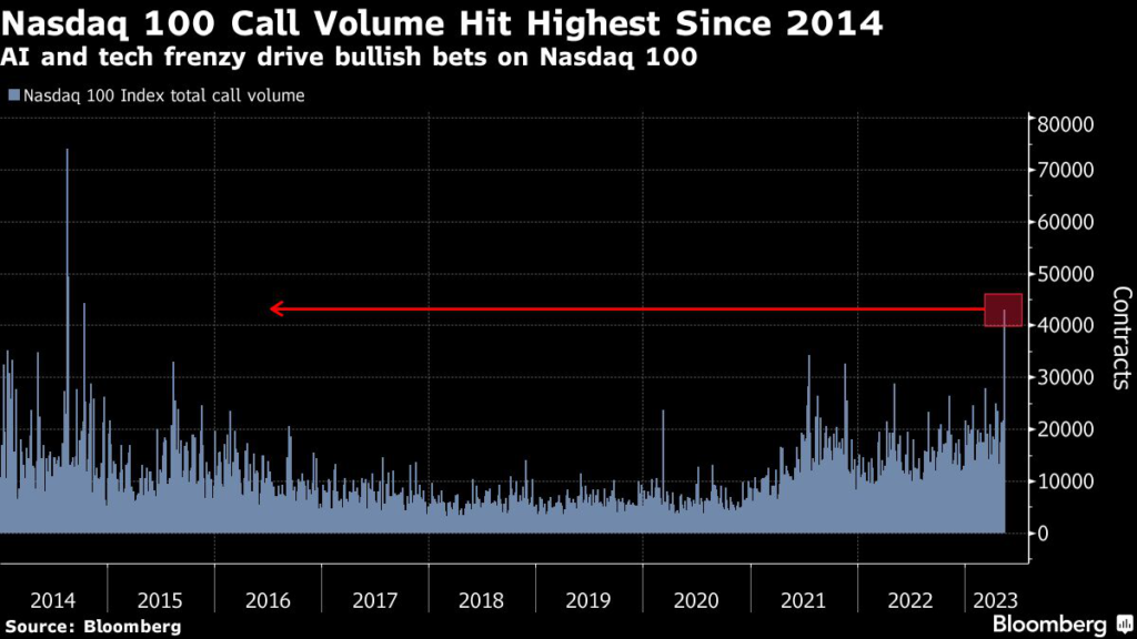 Buzz around artificial intelligence (AI) is arguably the biggest driver behind large bullish bets on the Nasdaq 100, where call volumes have hit their highest level since 2014.