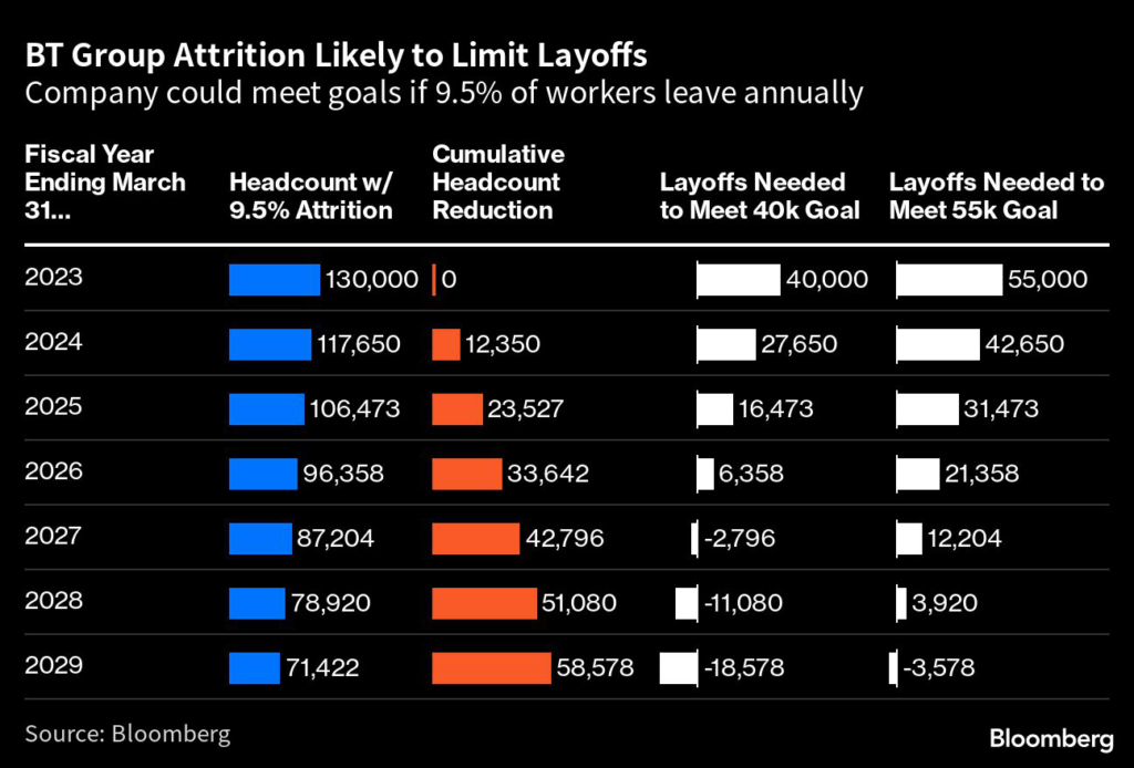 BT Group Plc’s plans to cut as many as 55,000 workers by the end of the decade can likely be accomplished with few mandatory layoffs because of how many people leave the company each year.
