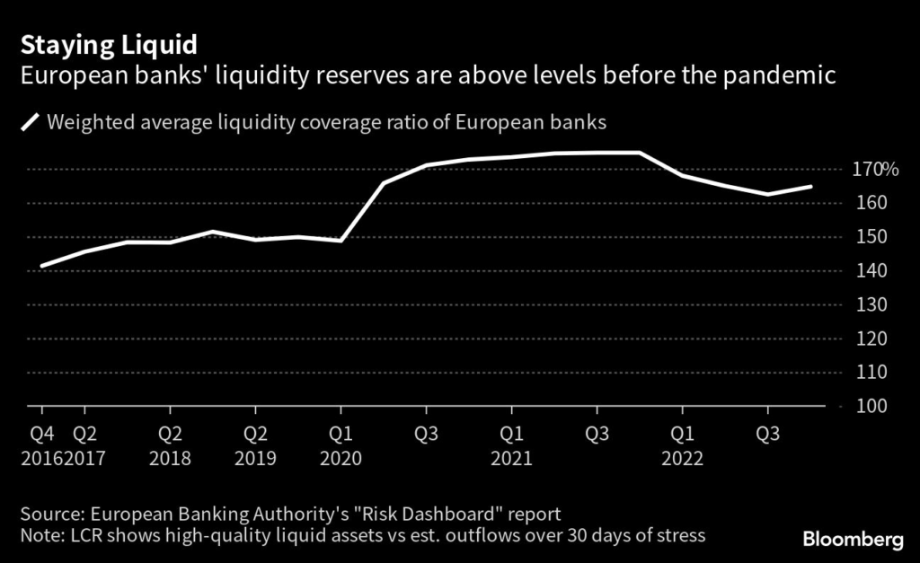The weighted average ratio for European banks stood at 165% in the fourth quarter, well above the 100% minimum, according to data from the European Banking Authority.