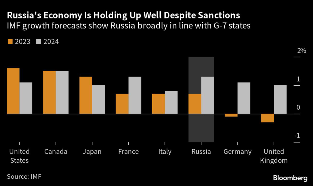 Barrages of sanctions have crimped growth but failed to deter President Vladimir Putin’s military assault on Ukraine, and Russia’s economy has been underpinned by commodity and energy exports to countries outside the G-7.