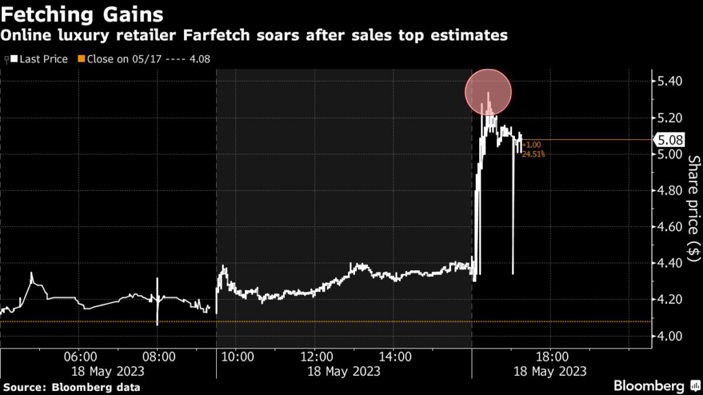 (Bloomberg) — Farfetch Ltd shares jumped as much as 21% in pre-market trading following financial results that beat Wall Street’s expectations, a sign that luxury retail could still be a port in the storm amid a slowdown in discretionary shopping.
