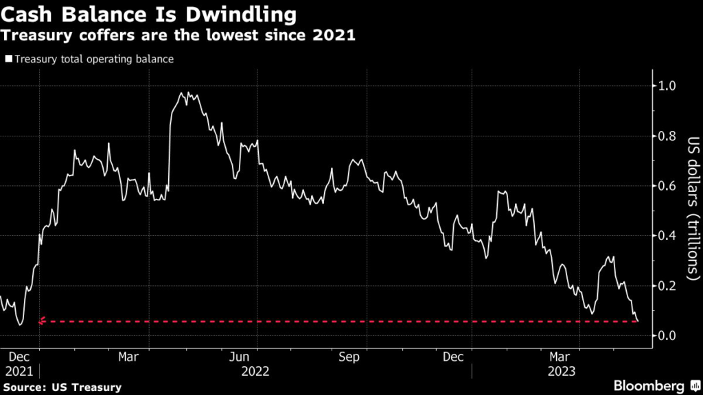 (Bloomberg) — The US Treasury’s window to keep the US government from running out of borrowing room continues to narrow as declines in its cash balance to the lowest since 2021 offset a slight uptick in funds available for extraordinary measures.